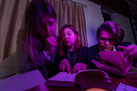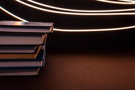 A stack of old books. Vintage book on wooden table. Magic lightning around a glowing book in the room of darkness. Selective focus
