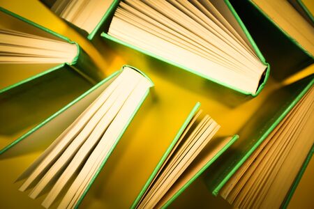 Books. Lots of colourful thick open books stand on a dark background. ready to read