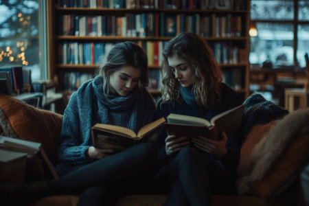 Two young women are sitting on a comfortable sofa, engrossed in reading books in a cozy library setting
