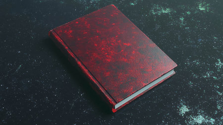 Realistic top view of a red hardcover book on dark background