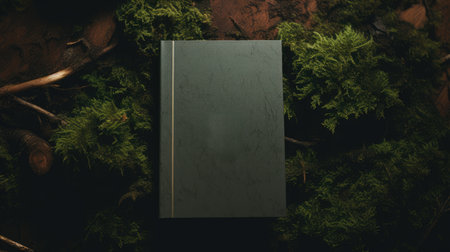 Blank book on a background of green moss. Book mockup.