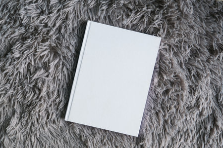 top view of blank book mockup on decorative gray fluffy rug. Template book cover