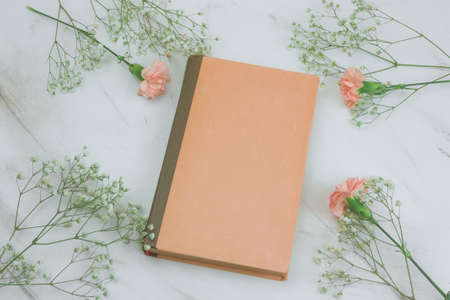 top viewvintage book with empty sheets and flowers on a marble background