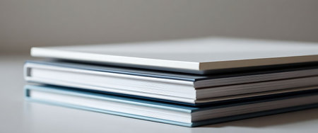 Minimal white hardcover book mockup standing vertically. Studio setup with solid background. Blank book cover. Design for invitation, postcard, banner, poster. High quality