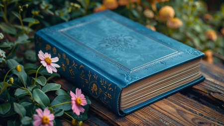 blue book on old wooden table