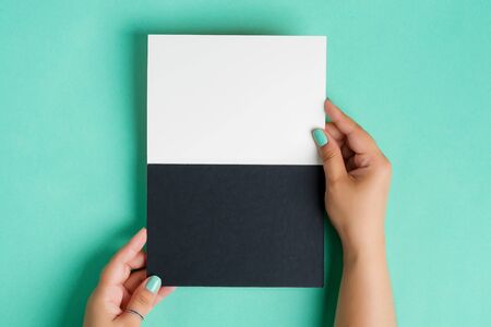 Woman's hands are holding blank mock-up duotone white and black paper sheet for writing text or message above pastel turquoise background, copy space. Top view.