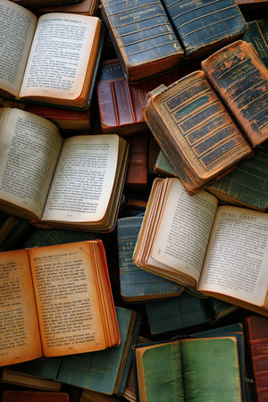 This image showcases a collection of aged, hardbound books arranged in a circular pattern with their pages opened. It evokes a sense of history, knowledge, and scholarly pursuits.