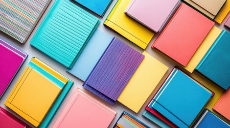 A colorful array of multicolored notebooks with different cover designs, stacked in an organized fashion on a white background.