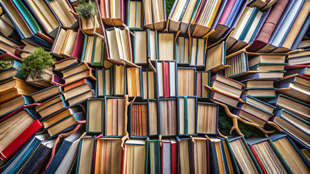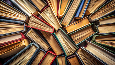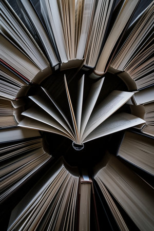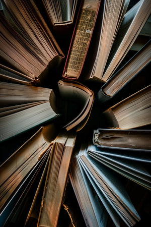 A captivating aerial perspective of numerous hardback books arranged in a circular pattern, radiating outward from an open book at the center, creating a dynamic composition. .