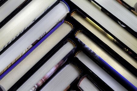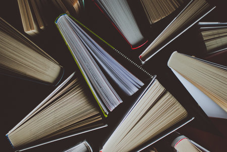 Lots of colourful thick open books stand on a dark background. ready to read