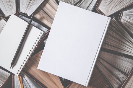 Mockup layout and a black pencil lie on multicolored open books in the library