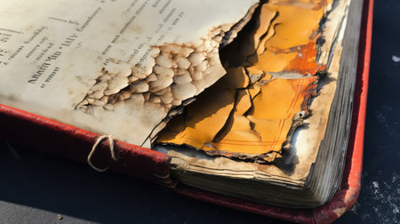 An ancient book lies open, its pages scorched and torn by fire and time.