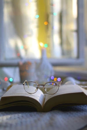 Open book and reading glasses with candles and colorful bokeh lights in the background. Selective focus.