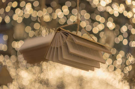 Concept of education, teaching literature, library. Spine end of an open old shabby book, pages fanned out on a background with copy space.