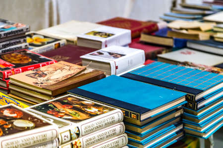 Berlin, Germany - October 22, 2018: Many used and stacked German books that were sorted out after reading.