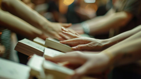Stack of books, blurry background: Charity book flea market, outdoors. Text space.