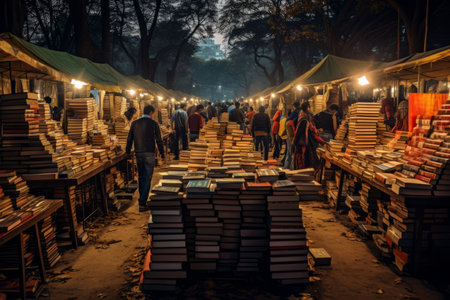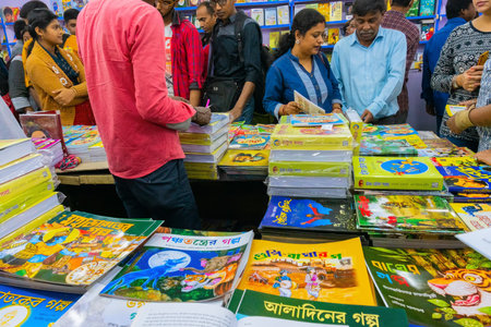 KOLKATA, INDIA - FEBRUARY 11TH , 2018 : Customers buying books inside a colorful bookstall at Kolkata book fair. It is world's largest, most attended and famous non-trade book fair.