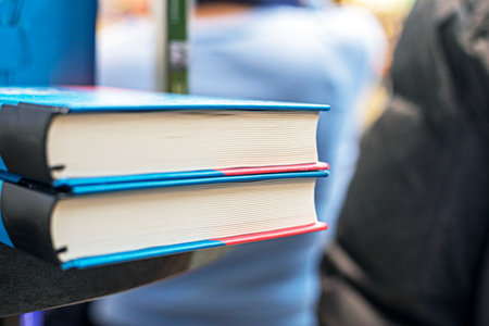 Book stack displayed in the book fair for business and education background. Education learning concept.