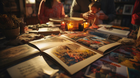 A well-lit art gallery interior featuring a collection of mounted photo prints on walls and an array of books on display tables.. AI Generation