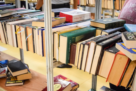 New Delhi, India, September 09 2023 - Variety of Books on shelf inside a book-stall at Delhi International Book Fair, Selection of books on display in Annual Book Fair.