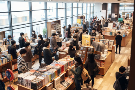 An expansive, modern bookstore or library is filled with towering floor-to-ceiling bookshelves packed with countless books. The aisles are bustling with people, whose movement is captured with a subtle motion blur, conveying a lively atmosphere of learning and discovery. The perspective emphasizes the immense scale of the collection.