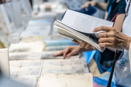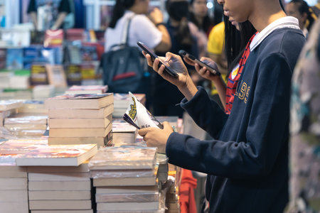 Bangkok, Thailand - April 6, 2019 : People choose books at Bangkok International Book Fair at Queen Sirikit National Convention Center