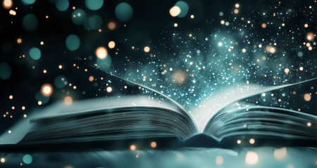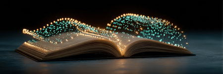An open book surrounded by a soft glow releases shimmering sparks into the air, creating a captivating and mystical ambiance. The dark background enhances the magical effect.