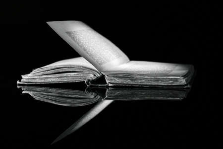 High contrast black and white image of an old book on black reflective surface
