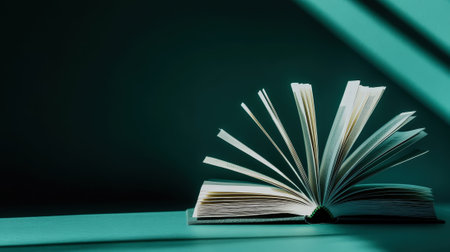 Aesthetic open book with flipping pages, on dark green background, minimalist. Reading concept. Generative AI.