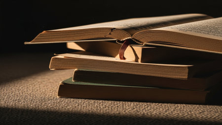 education and self-improvement, stack of books with one open on top of themshot from eye level with shallow depth of field