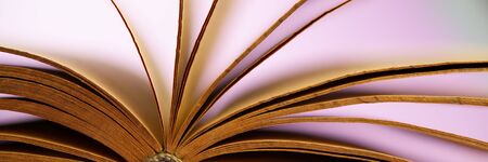 Pages of an old open book on a pink background. Close-up. Web banner.