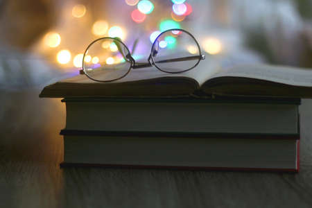 Open book and reading glasses with candles and colorful bokeh lights in the background. Selective focus.