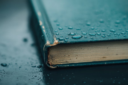 Raindrops cling to the spine of an ancient book, creating a serene ambiance on a gray, rainy day.
