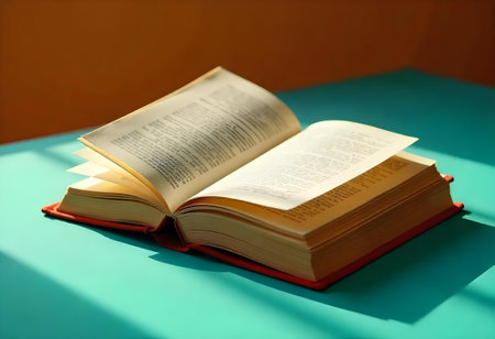 A beautifully opened book lies on a turquoise surface, illuminated by warm afternoon sunlight. The pages are slightly curled, revealing a treasure trove of words.