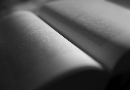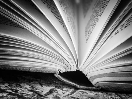 Close up of open book in grayscale