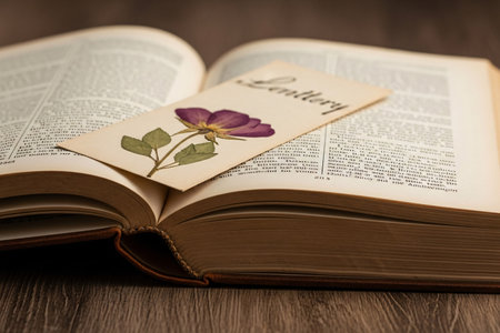 Detailed view of a vintage letter and a dried flower pressed inside the pages of an antique book as a sentimental marker.