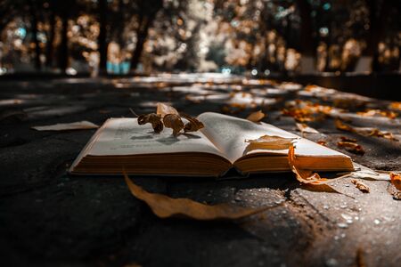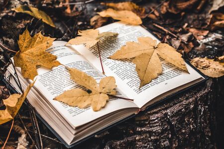 leaves on book on the garden ground