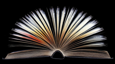 This image features an open book with its pages fanned out, set against a transparent background. The book's pages are clearly visible, creating a symmetrical and visually appealing pattern. The image is ideal for use in design projects, educational materials, or digital presentations.