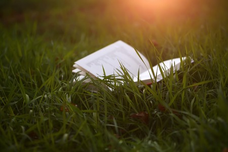 Poetry book under tree and blurs of summer sunset background