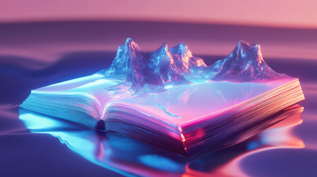 A beautifully lit open book on a reflective glass table, pages slightly curled.
