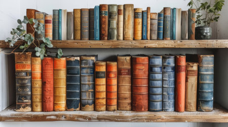 Vintage Books on Wooden Shelf Knowledge and Literature, background for world book day concept