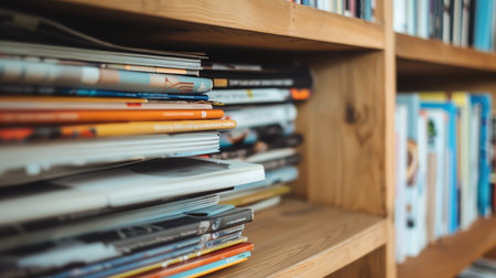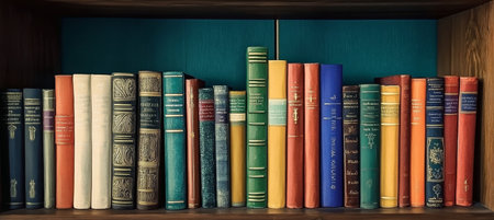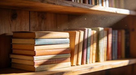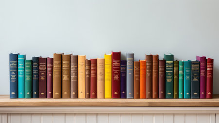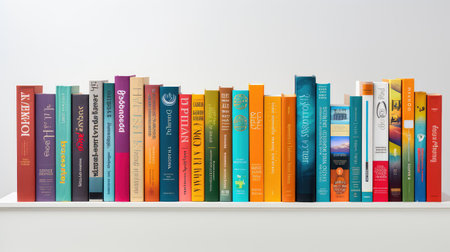 A stack of books with colorful spines on a shelf created with Generative AI