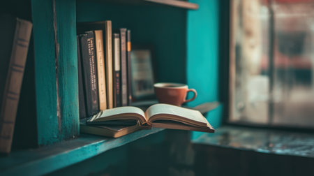 A serene scene depicting a welcoming reading space featuring an open book and a steaming coffee cup on a shelf, bathed in warm natural light from a nearby window.