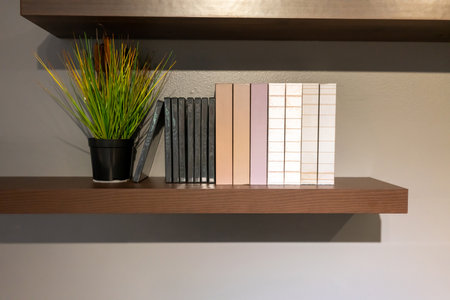 Books and decoration planting on wood shelf againt grey wall background.