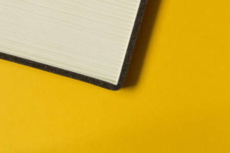 Front corner of old blue thick book with yellow pages close up isolated.