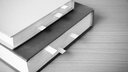 book with sticky note on wood background black and white color tone style