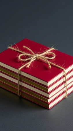 A striking, vertically oriented composition (9:16) featuring a centered stack of ruby-red notebooks