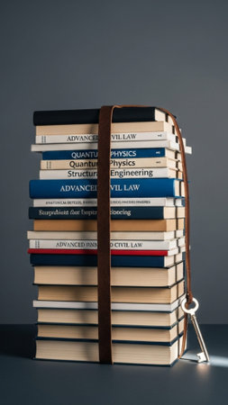 A high-contrast, sharp vertical still life focusing on a monumental stack of diverse professional te