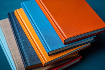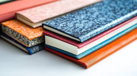 A close-up of a set of multicolored notebooks with different cover textures, placed side by side on a clean, white surface.