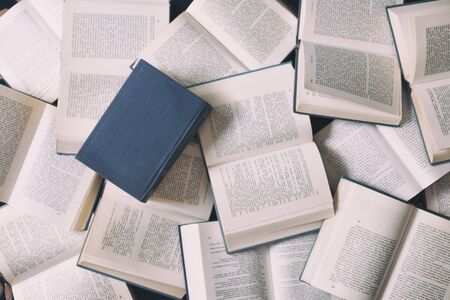 Stack of open vintage hardcover book on the table. Selective focus.